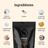 Ingrediënten per portie (12 g): zuren (citroenzuur), glycine (2000 mg), inuline, L-leucine (1000 mg), L-glutamine (1000 mg), L-isoleucine (500 mg), L-valine (500 mg), chloride (398 mg), magnesium malaat (230 mg), magnesiumcitraat, kalium (225 mg), calcium (126 mg), natuurlijke aroma's, zout (sodium) (130 mg), fosfor (98.3 mg), zoetstof (steviolglycosiden uit steviaplant), kleurstoffen (bèta-caroteen), zinkcitraat (1.5 mg).