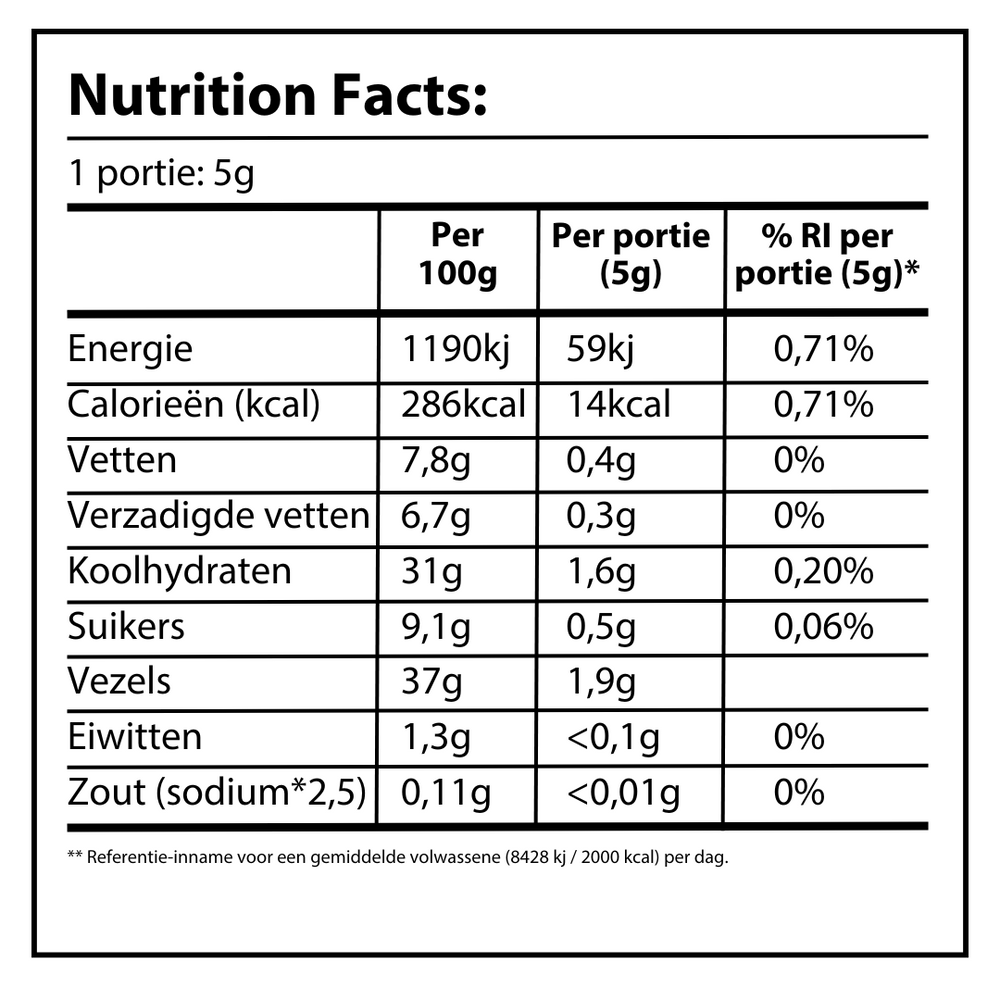 * Referentie-inname voor een gemiddelde volwassene (8428 kj / 2000 kcal) per dag.