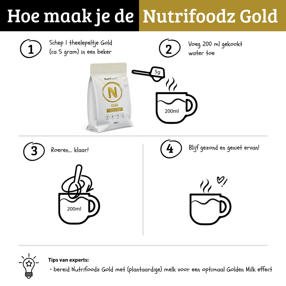 Bereid Nutrifoodz Gold met (plantaardige) melk voor een optimaal Golden Milk effect.
