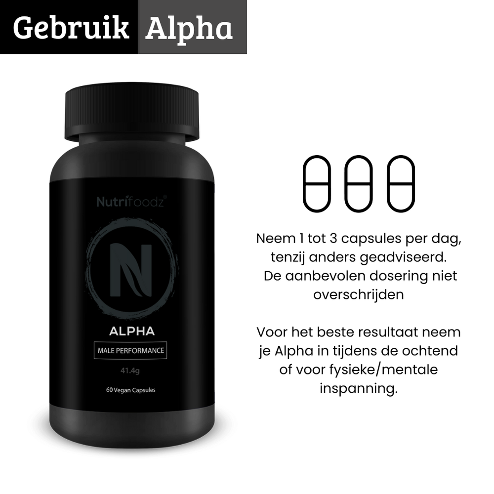 Neem 1 tot 3 capsules per dag, tenzij anders geadviseerd. De aanbevolen dosering niet overschrijden. Voor het beste resultaat neem je Alpha in tijdens de ochtend of voor fysieke/mentale inspanning.