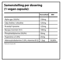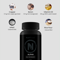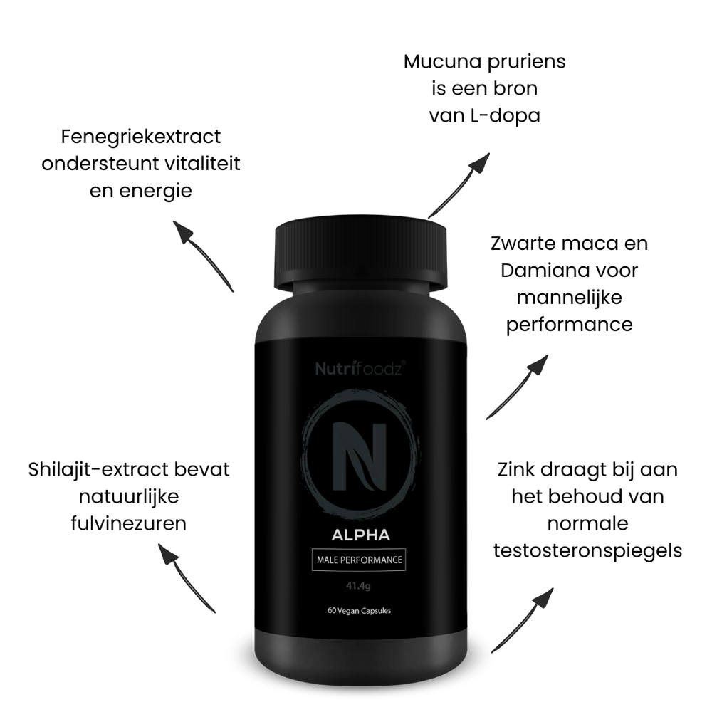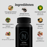 Ingrediënten: Fenegriekextract, HPMC (hydroxypropylmethylcellulose – capsulehuls), Shilajit-extract, Mucuna pruriens-extract, Damiana-extract, Zwarte maca-extract, Zinkglycinaat, Rijstmeel, Boorglycinaat, L-leucine, Vegan vitamine D3-poeder, Koperglycinaat, Selenomethionine
