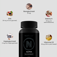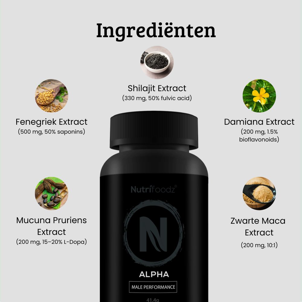 Ingrediënten: Fenegriekextract, HPMC (hydroxypropylmethylcellulose – capsulehuls), Shilajit-extract, Mucuna pruriens-extract, Damiana-extract, Zwarte maca-extract, Zinkglycinaat, Rijstmeel, Boorglycinaat, L-leucine, Vegan vitamine D3-poeder, Koperglycinaat, Selenomethionine