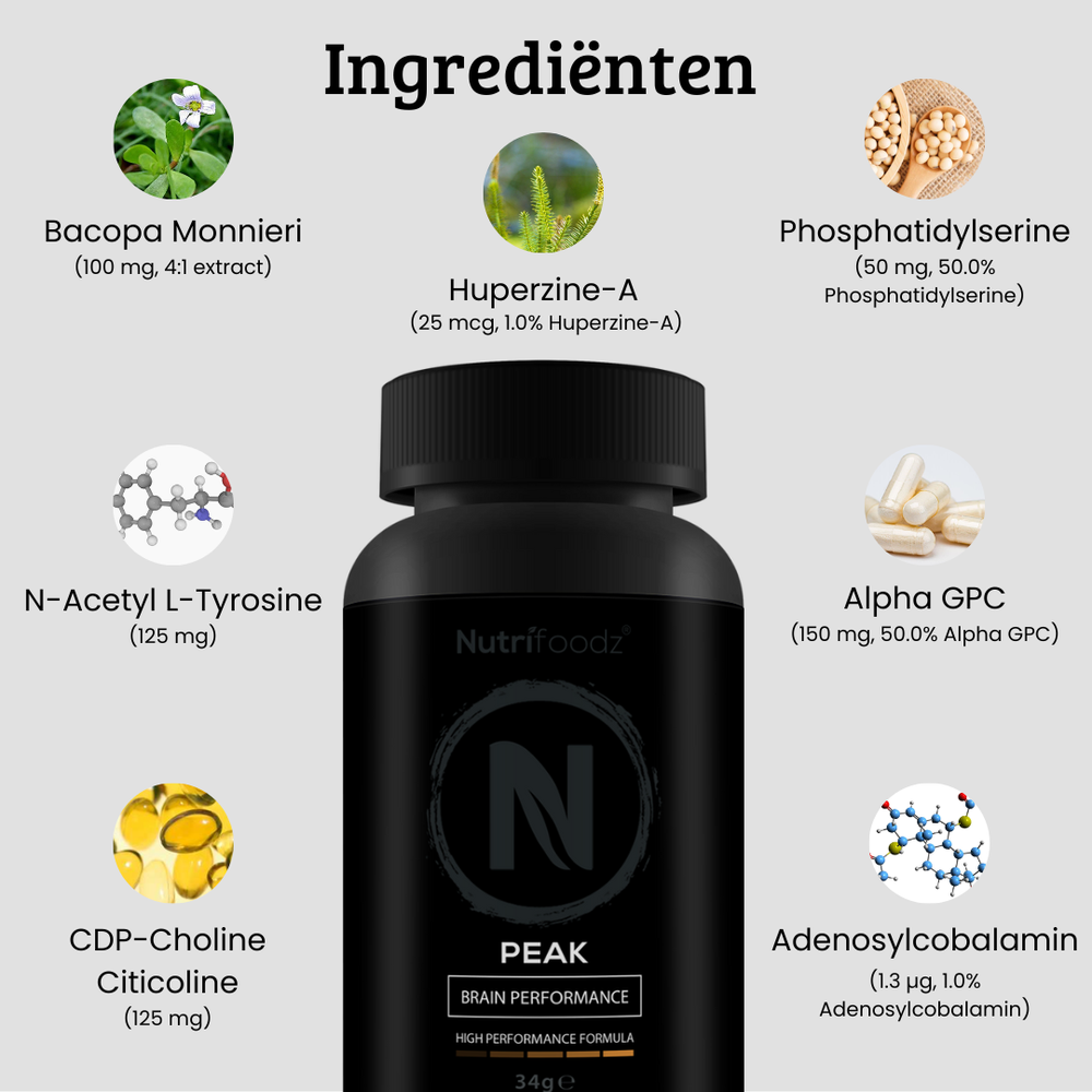PEAK maakt gebruik van zorgvuldig geselecteerde ingrediënten die goed gedocumenteerd zijn en vaak worden gebruikt voor hun positieve effecten op mentale prestaties en hersenfunctie.